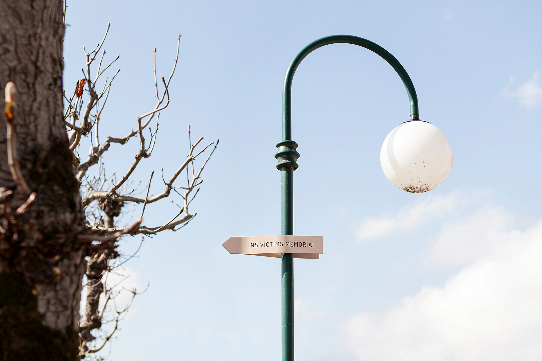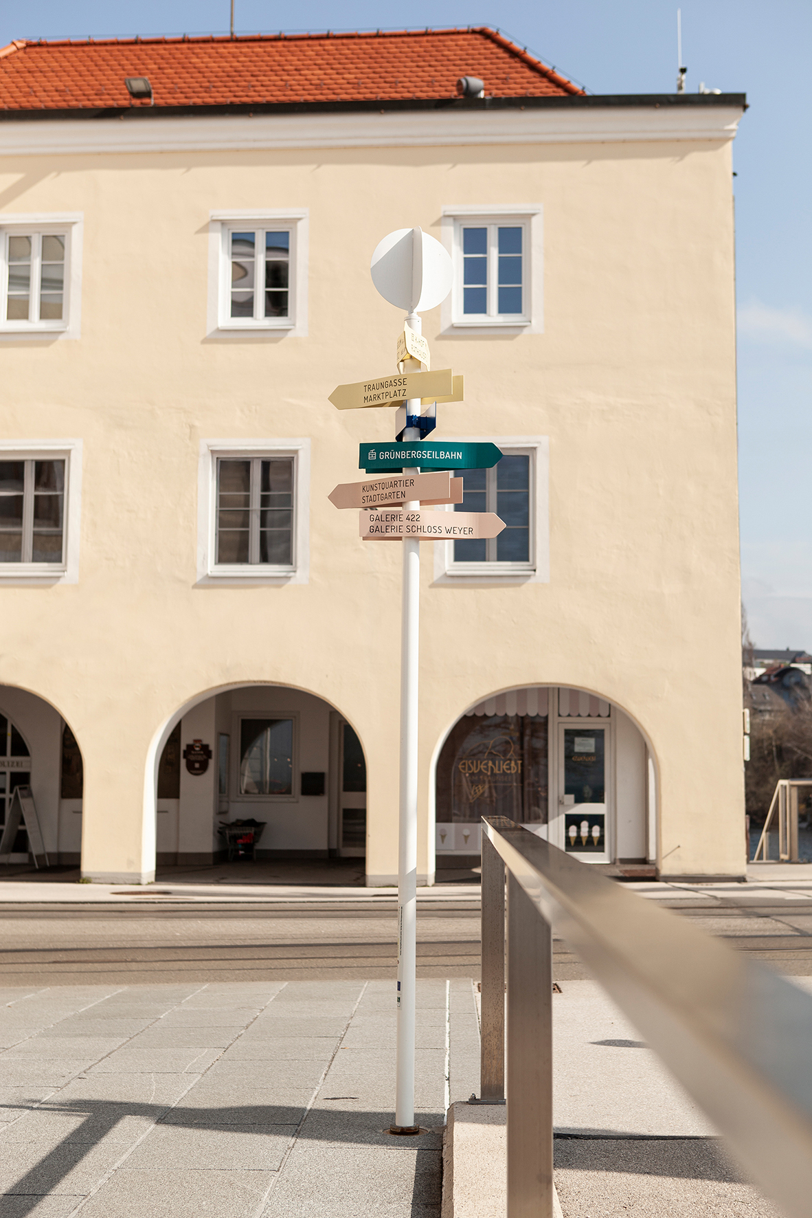 ORIENTATION AND GUIDANCE SYSTEM for the municipality of Gmunden. A system for guiding pedestrians into the city centre was developed specifically for the city of Gmunden. Arrows, which sit like brackets on the maritime white masts, whose mounting elements are discreetly concealed and whose striking tops are reminiscent of shipping signs, bring the lake into the city centre.
